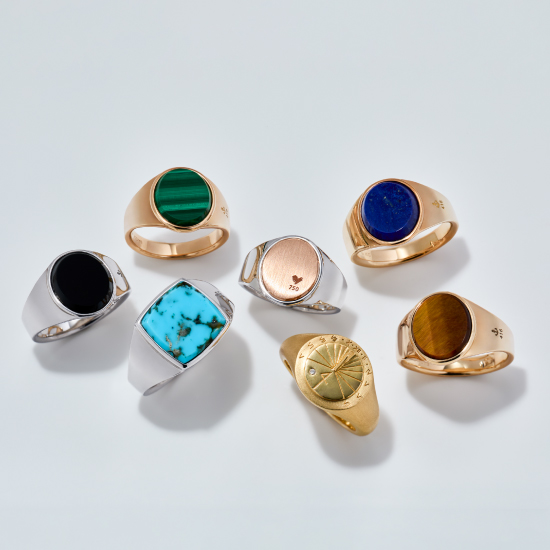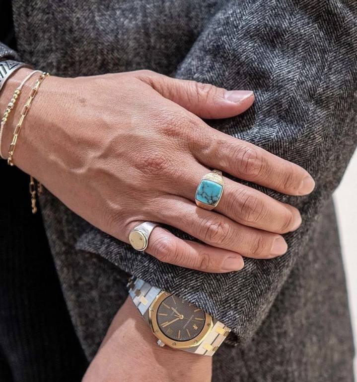 カジュアルシーンでは、シグネットリングのデザインがより大胆でカラフルなものが人気を集めており、ラピスラズリ、ターコイズ、マラカイト、タイガーアイ、オニキスなどそれぞれの宝石に意味をもち、個性を強調するための重要なアイテムとなります。