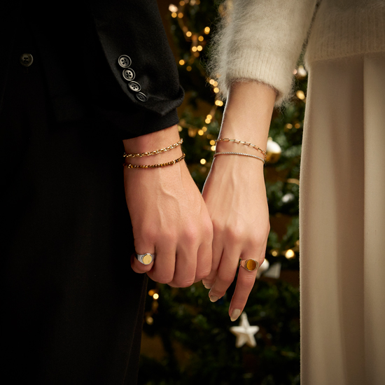 チェーンブレスレットは単体でも完成度の高いジュエリーですが、指元にシグネットリングを添えることで、手元の印象はさらに奥行きを増します。