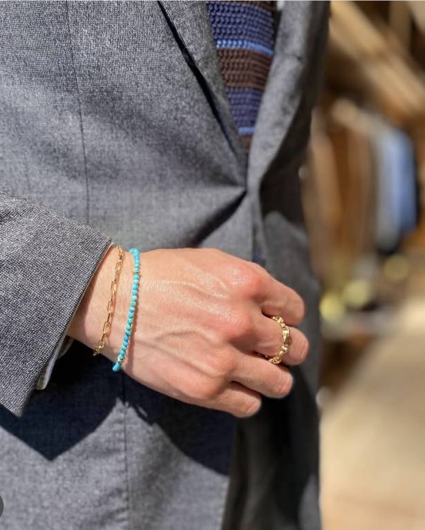 ターコイズは、装いに余裕と奥行きをもたらす天然石です。装飾を抑え、端正な造形と上質な仕立てで取り入れることで、大人の男性のスタイルに静かな深みを添えます。