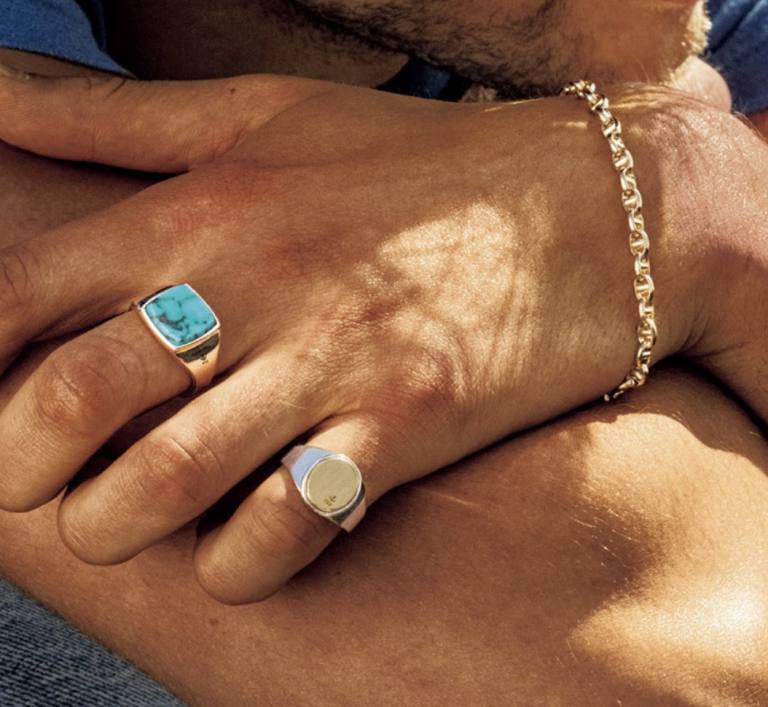 ターコイズのブルーは、ネイビーやグレーといった男性の定番色と高い親和性を持ちます。派手さではなく、装いに“抜け”と“余裕”をもたらす色として機能します。また、シンプルなシグネットリング(シグネットリングについては『シグネットリングの世界:歴史から現代のファッションまで-UPDATE』を参照)との組み合わせにおいても、ターコイズは非常に美しく調和します。