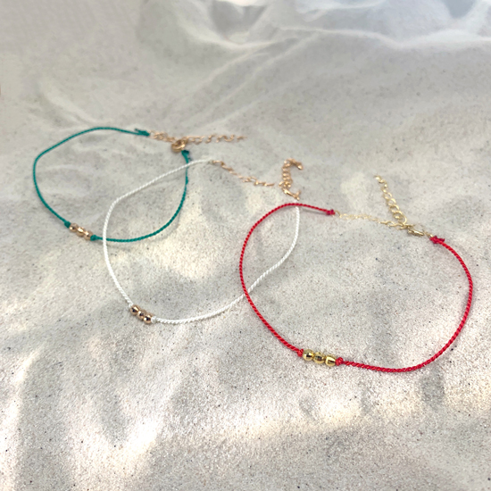 “赤”、“白”、“緑”の3種類の展開で、シルクコードにSV925+K18コーティングのカットボールが配されたシンプルなデザイン。ギラついた印象はなく、上品な印象で大人が毎日つけていても飽きがこないのがポイント。つければ、手元にさりげなくリッチな雰囲気を作ってくれます。