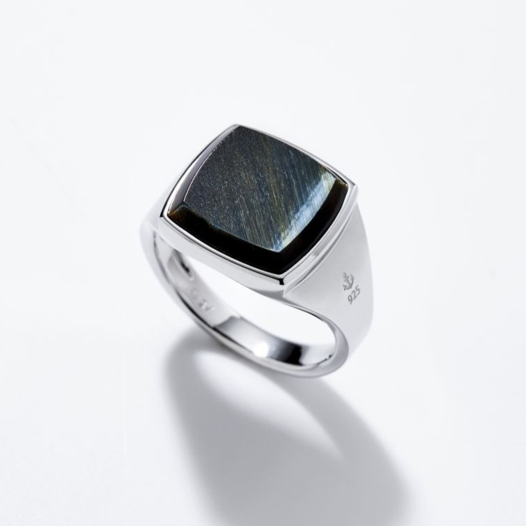 ホークアイは、“洞察力”や“未来を見通す力”の象徴とされ、ブルーグレーからダークネイビーへ揺らぐ光沢とキャッツアイ効果(シャトヤンシー)による静かな輝きが特徴。構築的なスクエアフォルムと磨き上げられた艶が、春の軽やかな装いに存在感を添えてくれる。