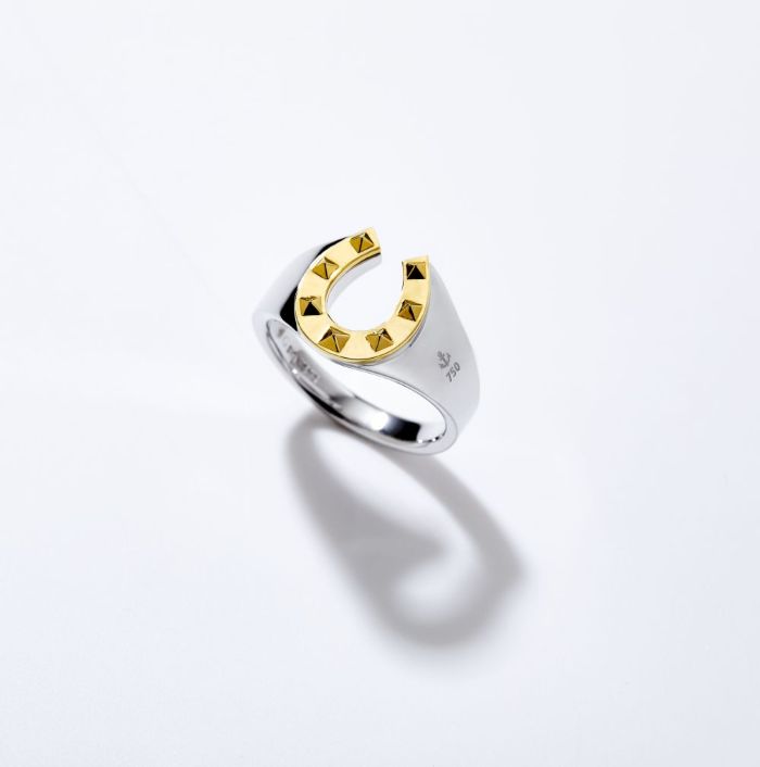 ホースシューモチーフには温かみのあるK18イエローゴールド、ベースにはロジウムコーティングを施したSV925を組み合わせ、二つの輝きが織りなすコントラストが、クラシックでありながらモダンな印象を生み出します。